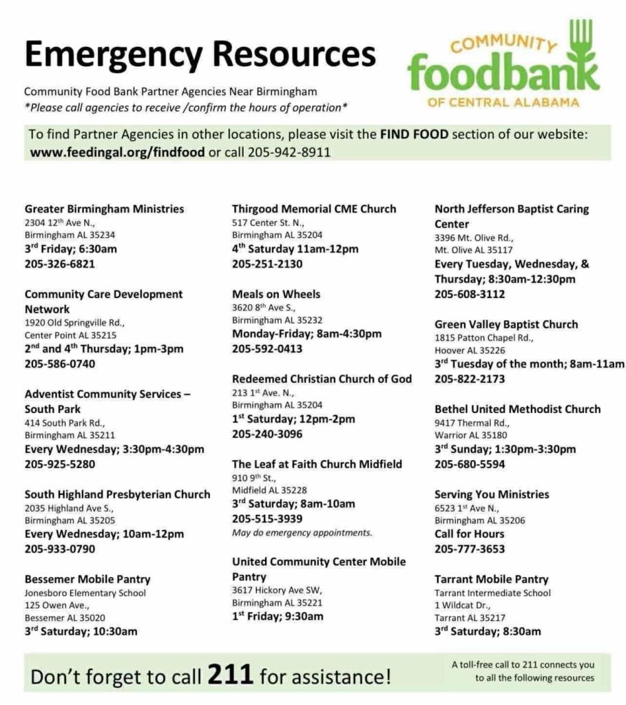 If you need food resources, Cooper Green is here to provide you with as many resources as possible. Below is a list of food resources in our community. Individuals can also call 211 toll-free that connects you to a variety of assistance, including food. If additional help is needed, please call Cooper Green Social Services at 205-930-3255.
